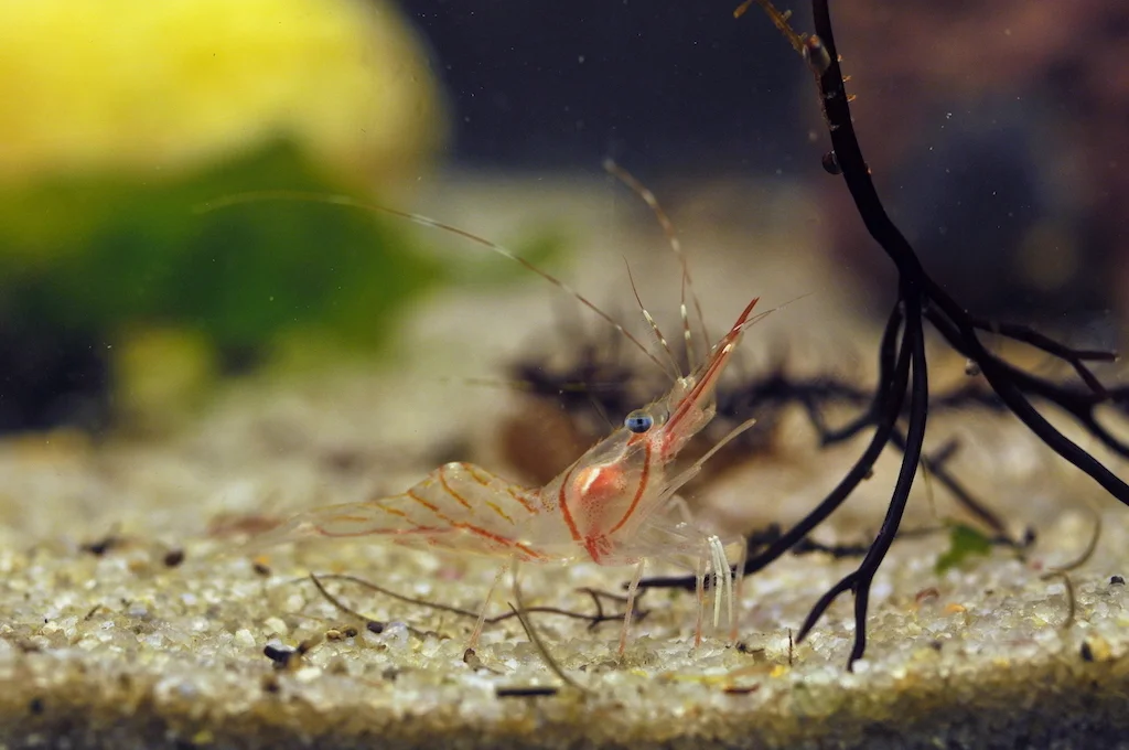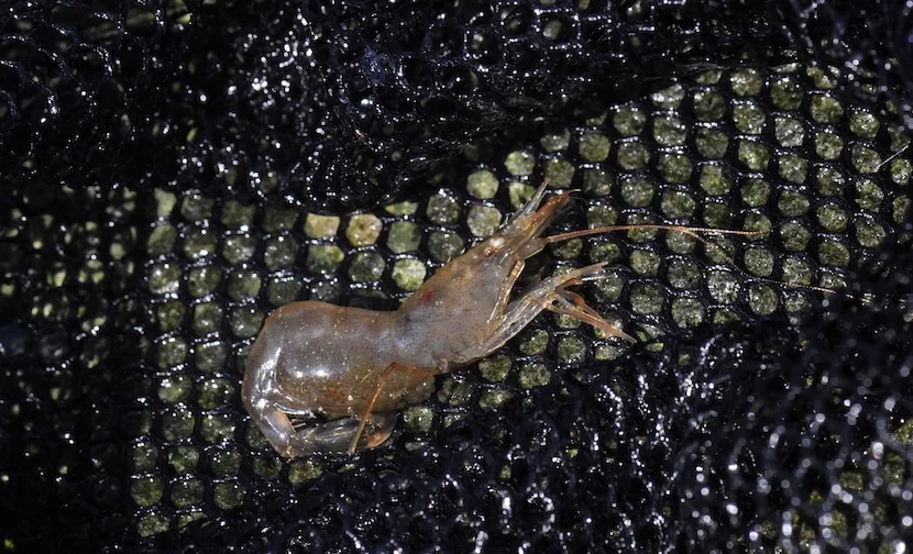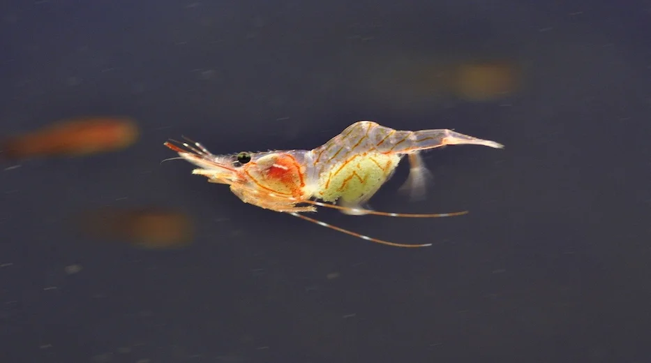 Rækja svimur frameftir, og kennir hon seg hótta, skjýtur hon seg aftureftir sum eitt skot. Hon brúkar sterku beinini á afturkroppinum at svimja við. Mynd: Hans Eli Sivertsen, Føroya Sjósavn