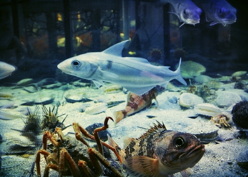 Sjósól er eisini eitt slag av krossfiski. Hon líkist krossfiski, men hevur vanliga fleiri armar. Á myndini eru eisini fleiri sjónotur. Mynd: Hans Eli Siversten, Føroya Sjósavn