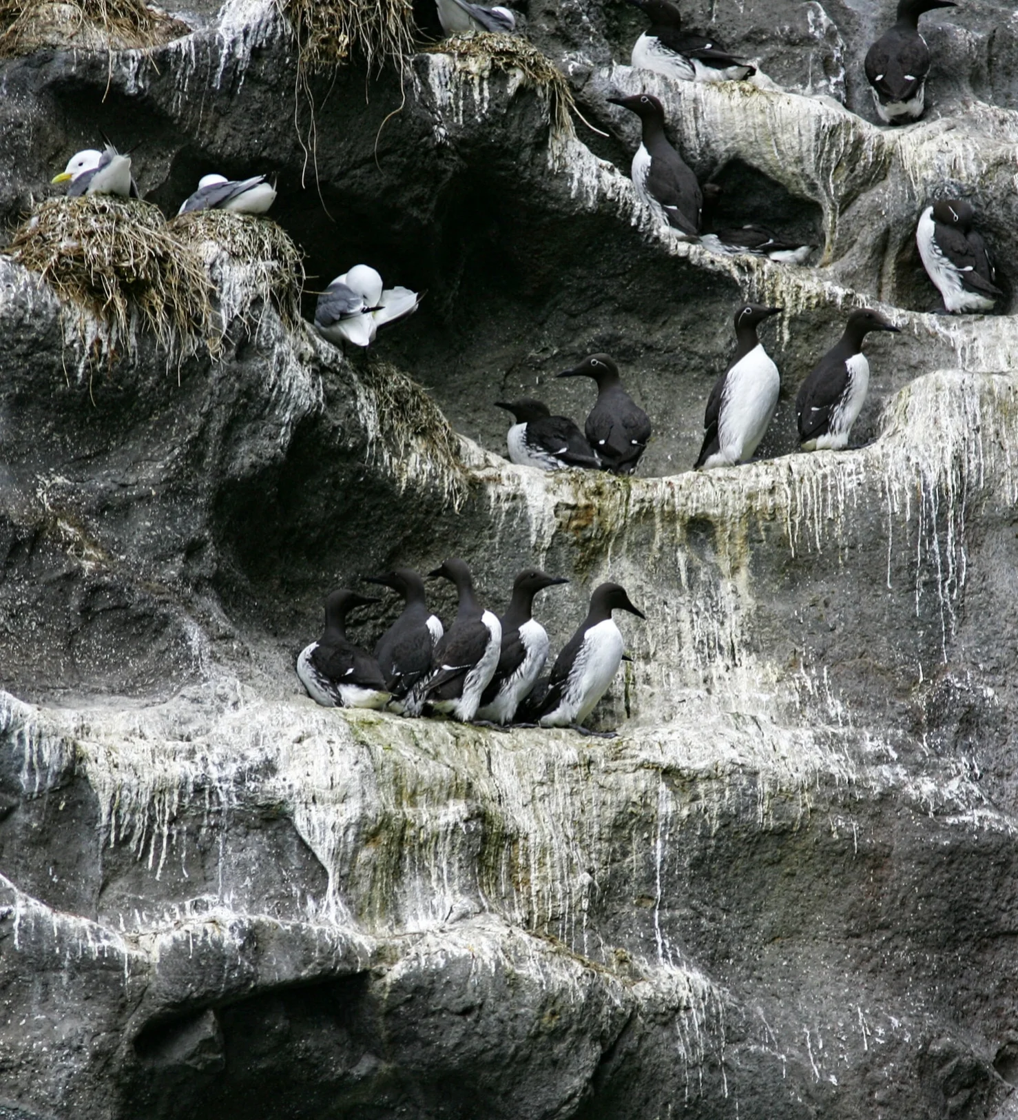 Rita klínir sær reiður fast í bergið og lomvigi verpur á bera hellu. Mynd: Ólavur Frederiksen