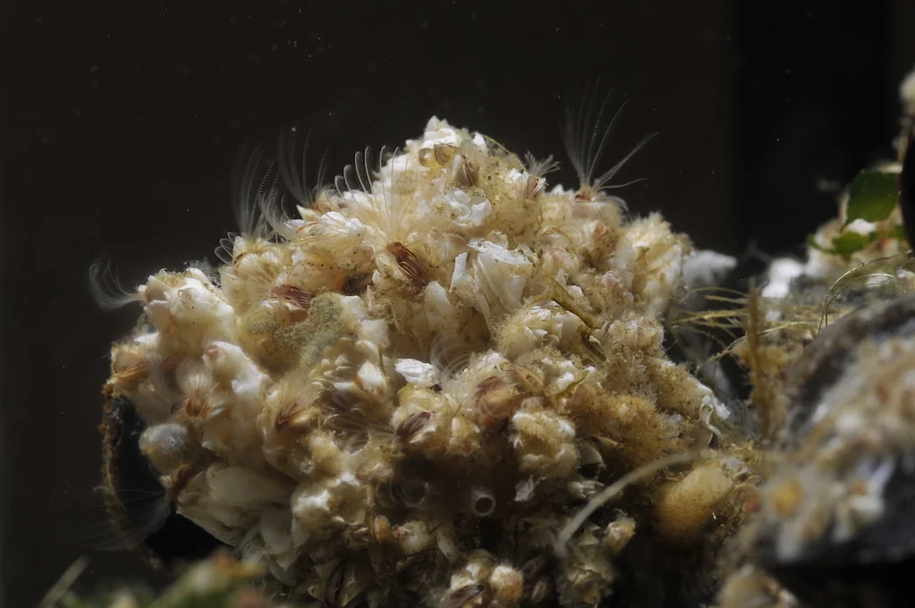 Gjar er eitt krabbadýr. Krabbin býr inni í einum kálkhúsi. Krabbin liggur á rygginum inni í húsinum. Tá ið hann vil hava eta, letur hann tvær lúkur up og strekkir beinini úr. So sveiggjar hann við beinunum og fangar tað, sum rekur framvið. Mynd: Hans Eli Sivertsen, Føroya Sjósavn