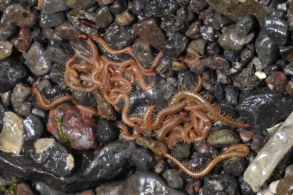 Skolopendarar undir steini í fjøruni. Mynd: Hans Eli Sivertsen, Føroya Sjósavn