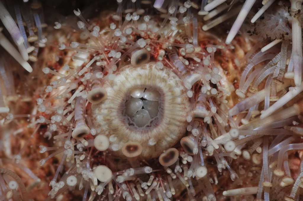 Tindadýr hava ikki høvd. Munnurin situr oftast á undirsíðuni og gotið omaná sum hjá igulkeri. Á myndini sæst týðiliga, at muðurin hjá igulkeri er fimmbýttur. Mynd: Hans Eli Sivertsen, Føroya Sjósavn